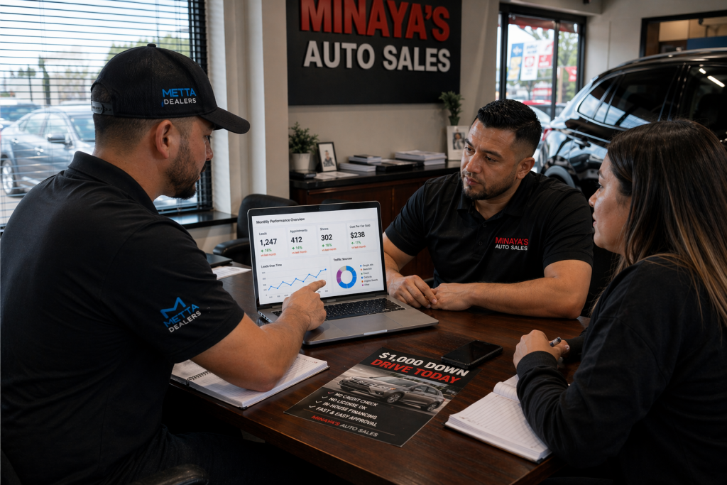 We stay hands on with your store every month by reviewing the numbers, spotting what is working, and adjusting the strategy so you keep selling more cars without wasting ad spend.